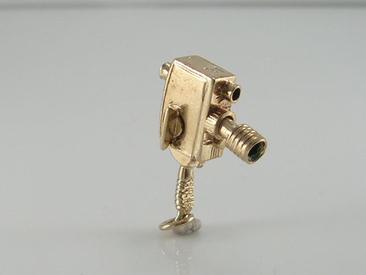Vintage 3D 9ct gold mechanical hand film cine camera charm...lens moves slightly in and out...