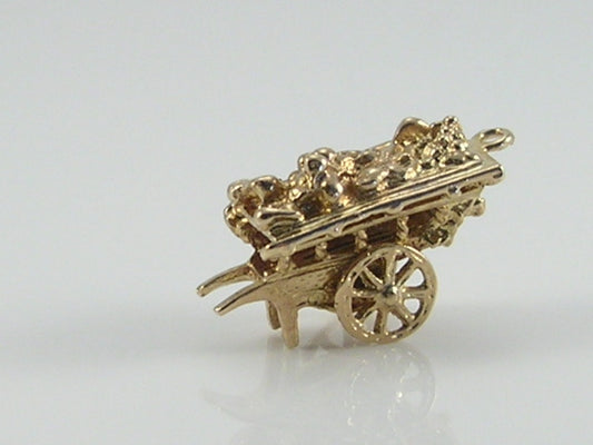 Vintage 3D 9ct gold market trader man pushing fruit and vegetables barrow charm pendant Movable...