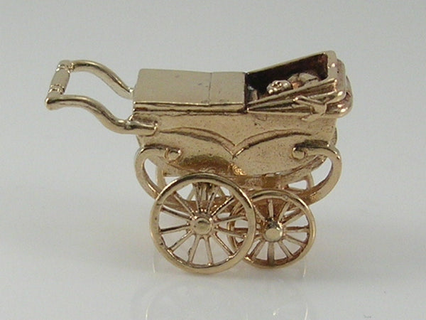 Vintage 3D 9ct gold baby sitting up in pram charm...movable wheels turn Measures approximately 15mm...