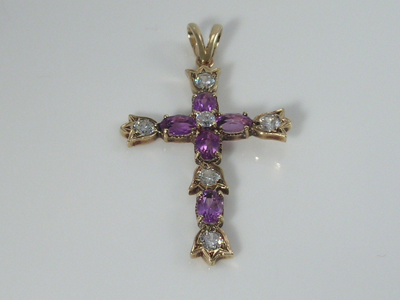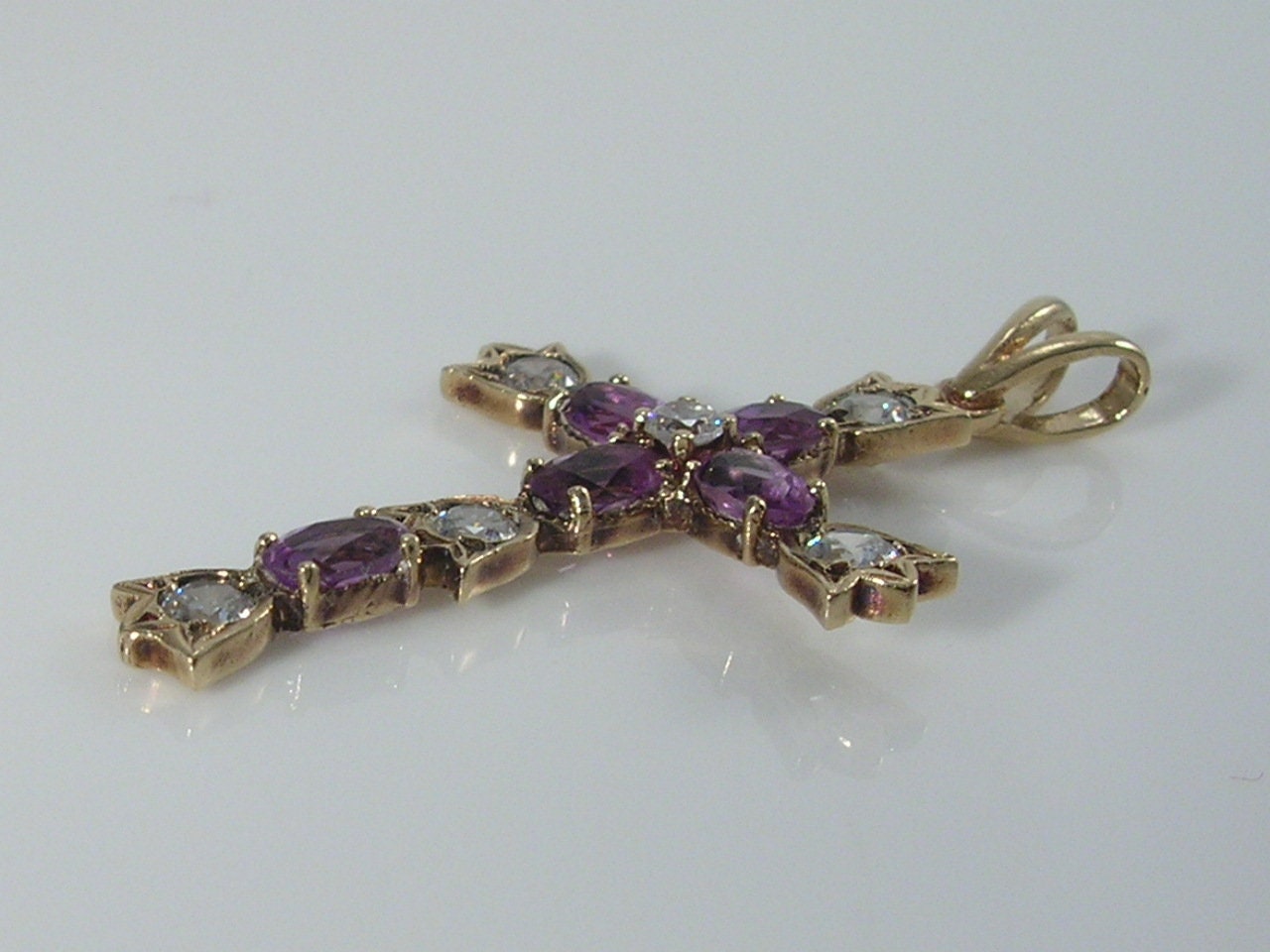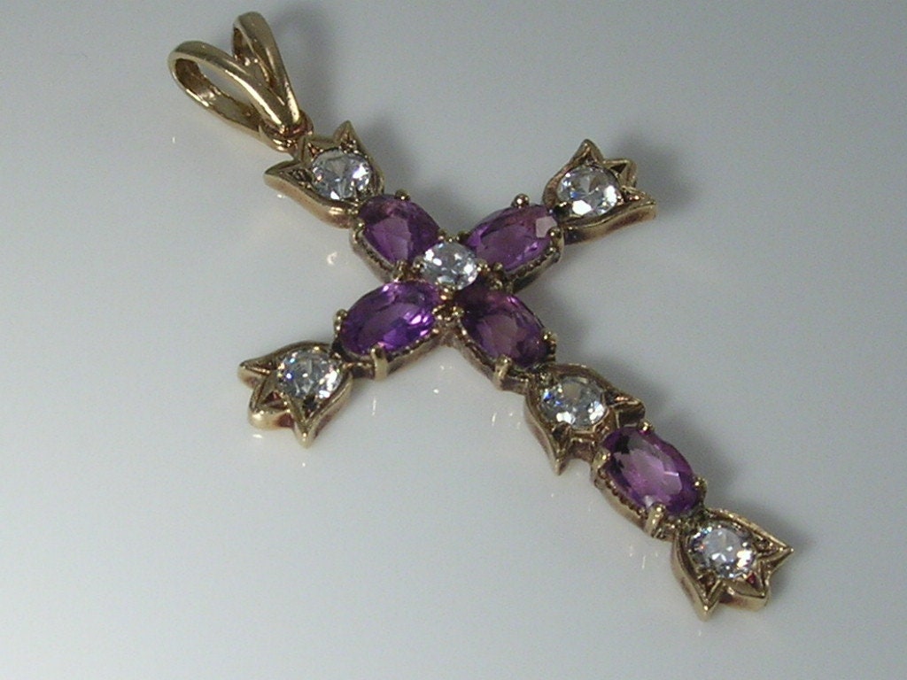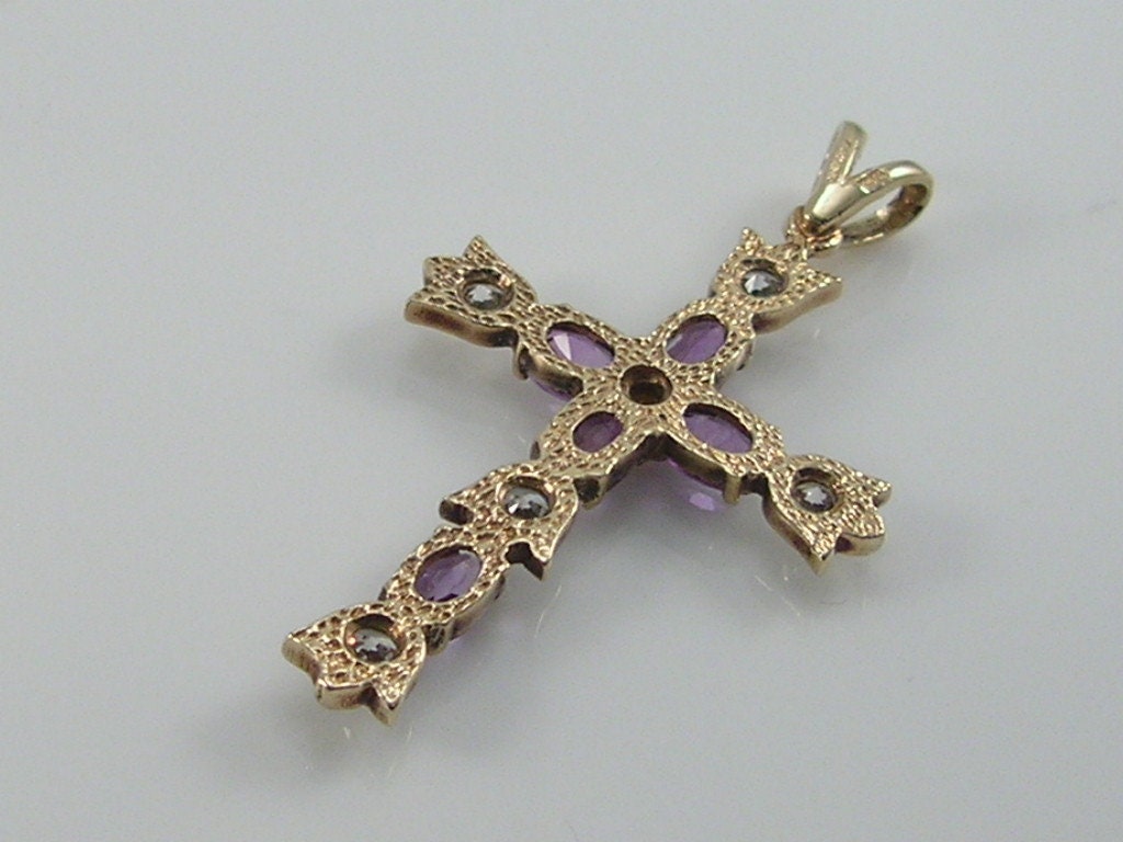 Gorgeous vintage 9ct gold amethyst & cubic zirconia CZ Cross pendant