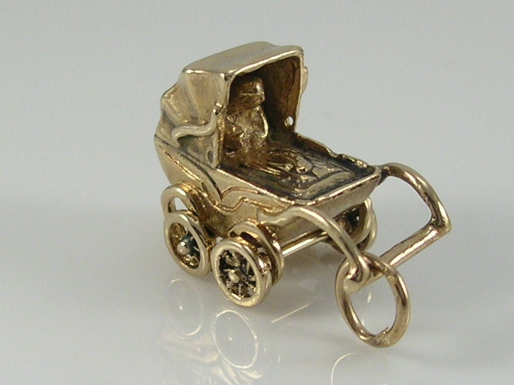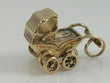 Vintage 3D 9ct gold baby sitting up in pram charm...movable wheels turn