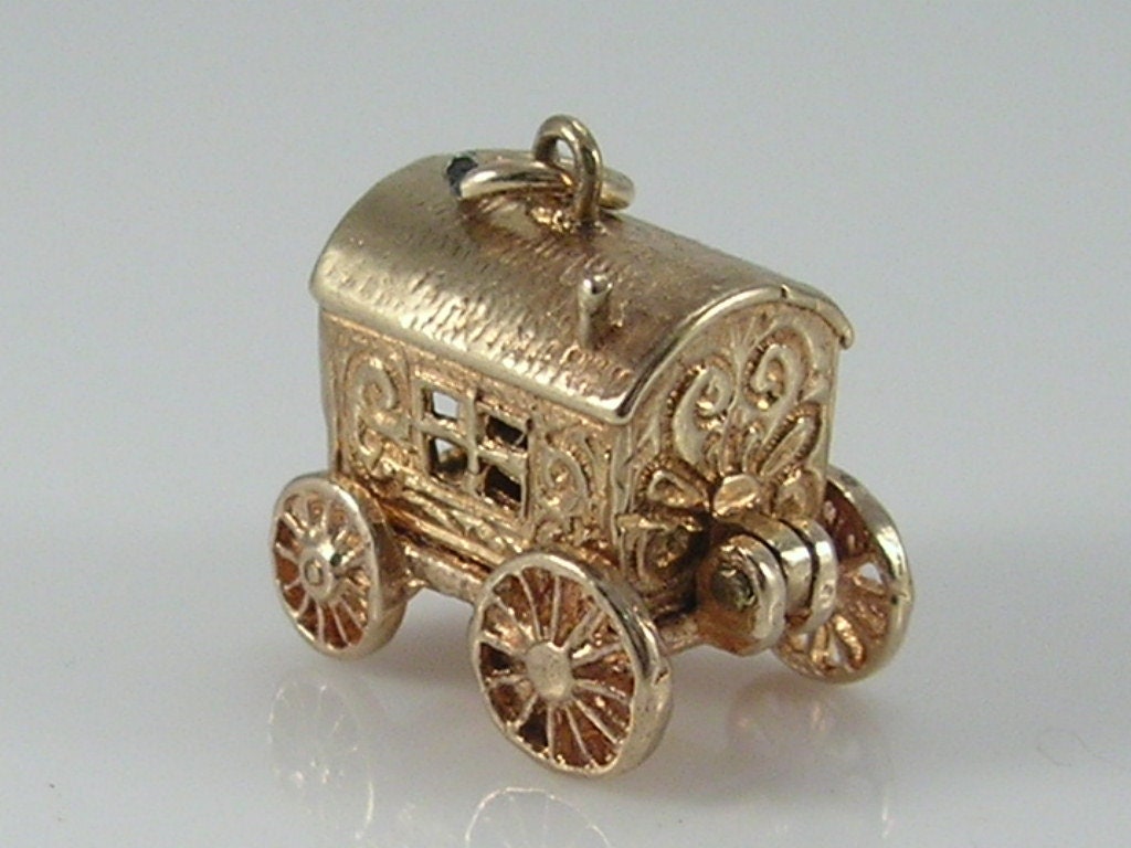 Vintage 3D 9ct gold gypsy caravan charm pendant..opens to reveal gypsy fortune teller with her crystal ball