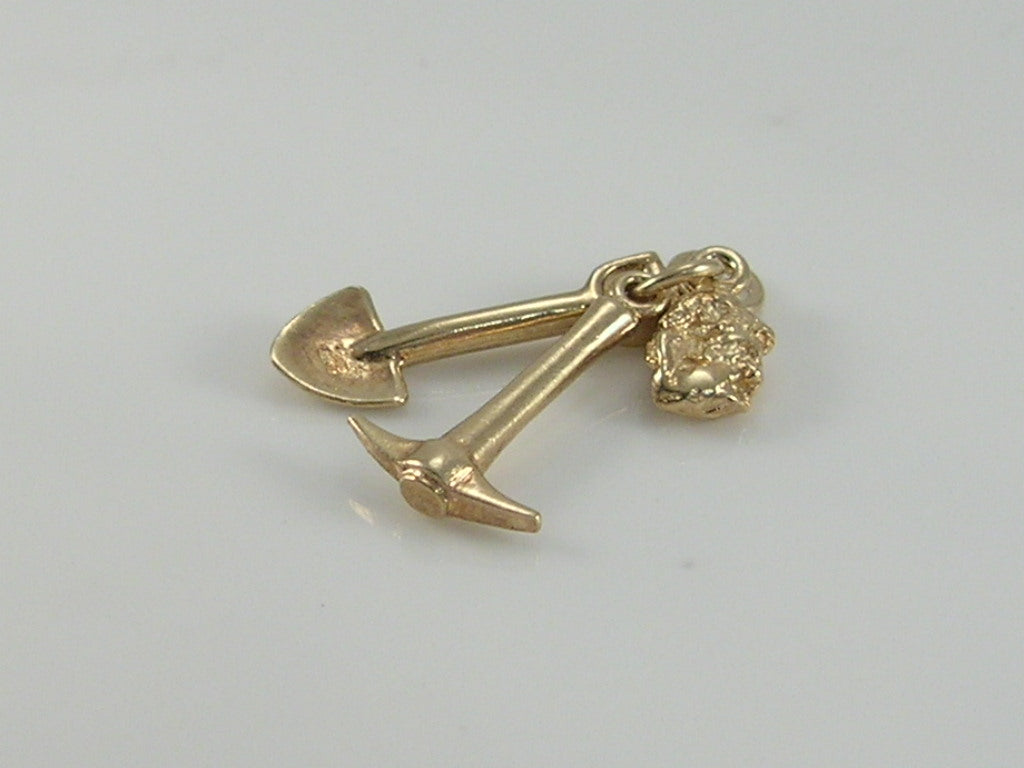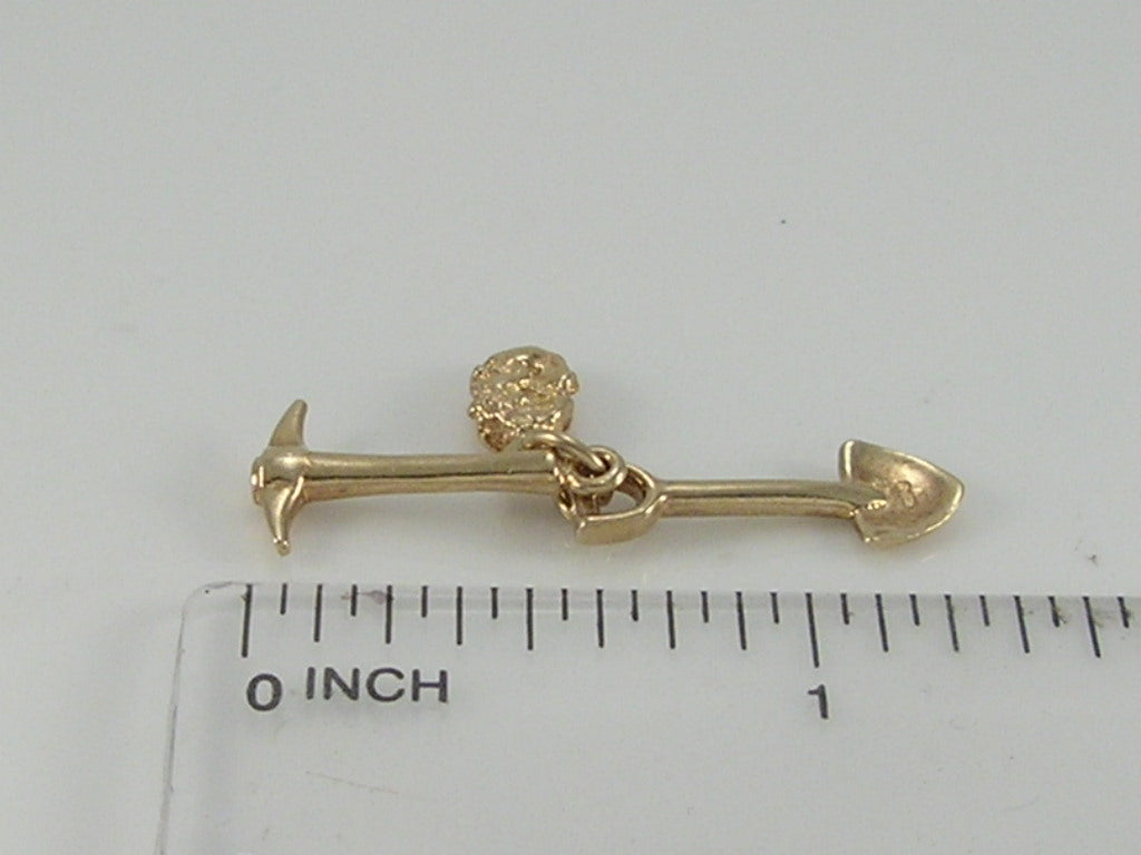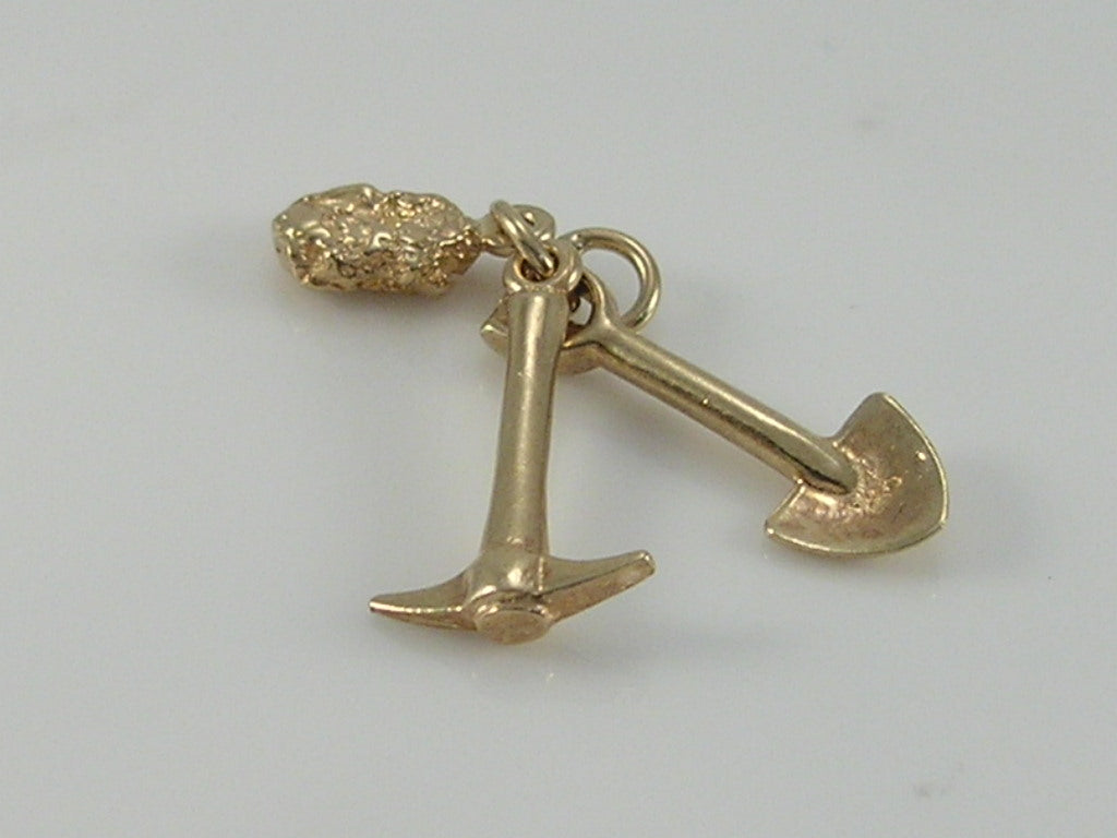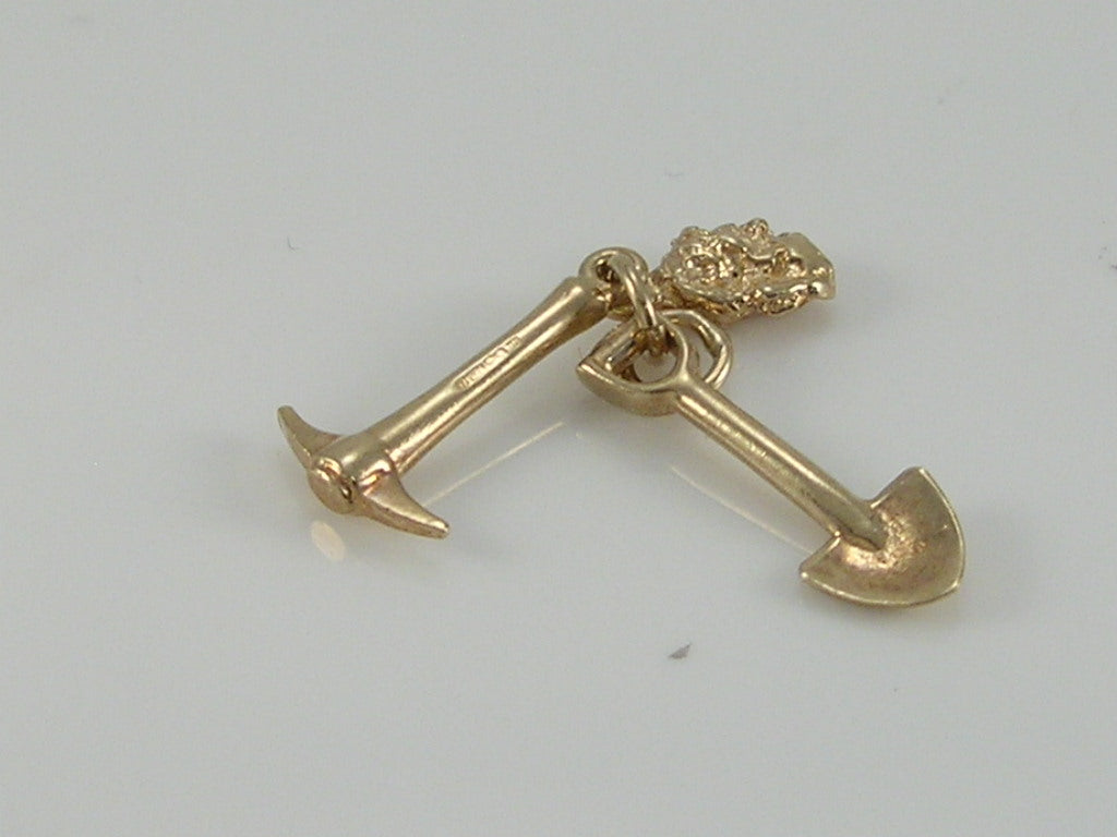 Vintage 3D 9ct gold mining gold prospectors pick, shovel & gold nugget charm pendant...movable, each charm moves freely on the central ring