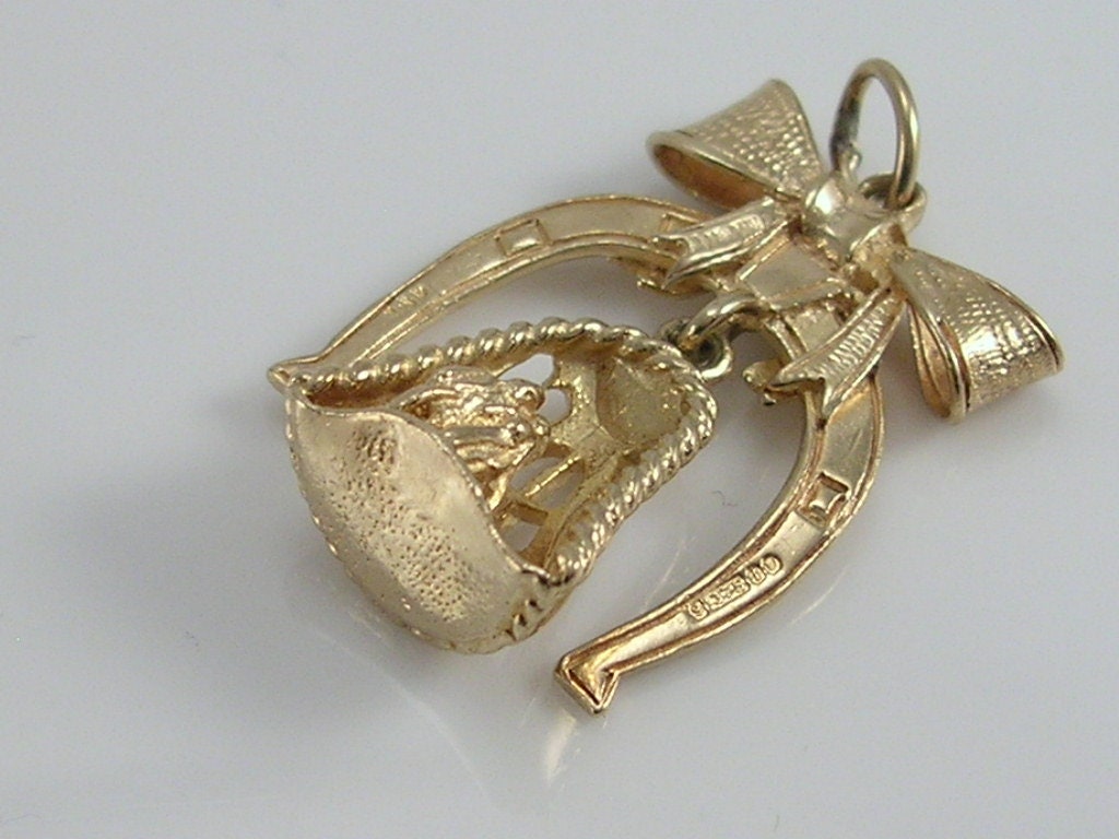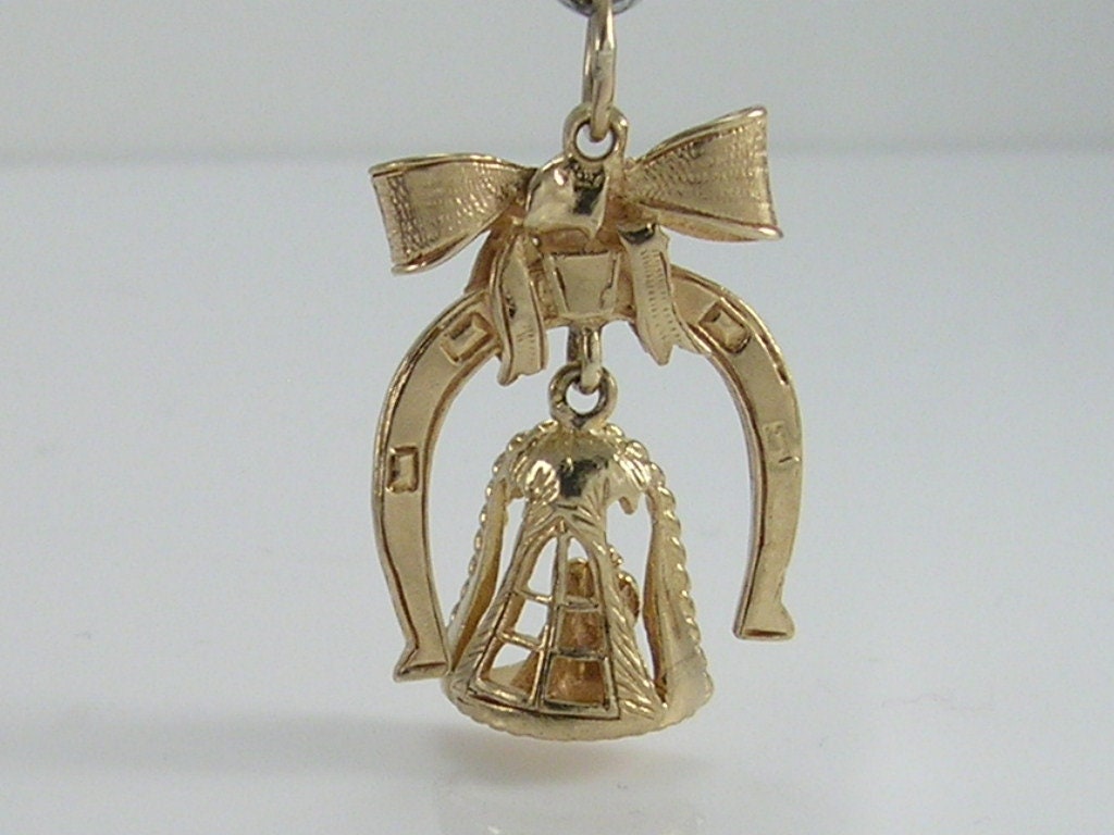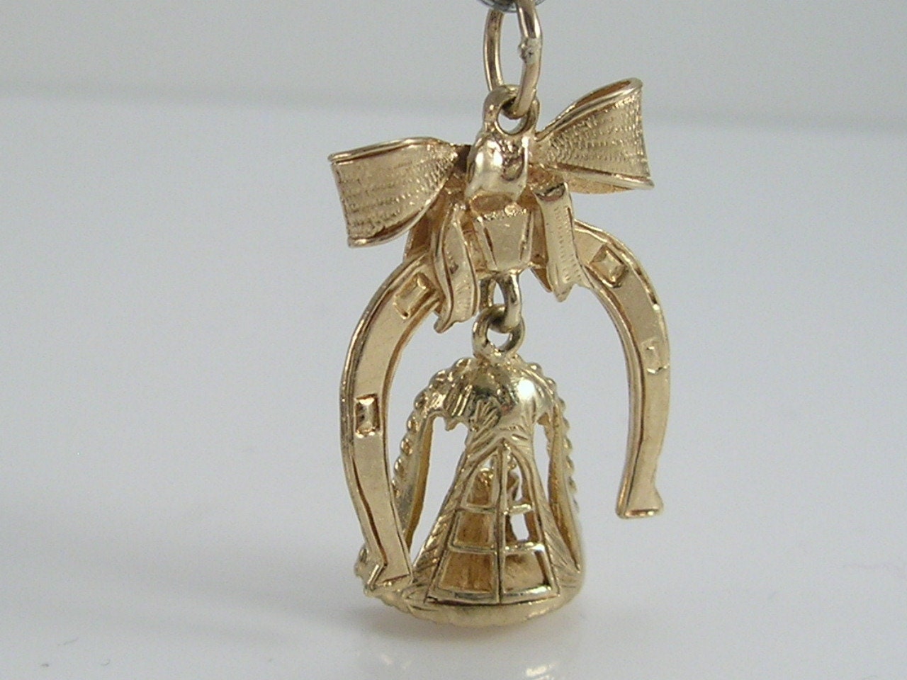 Vintage 3D 9ct gold lucky horseshoe & bow & wedding bell charm pendant...movable bell dangles and moves from side to side