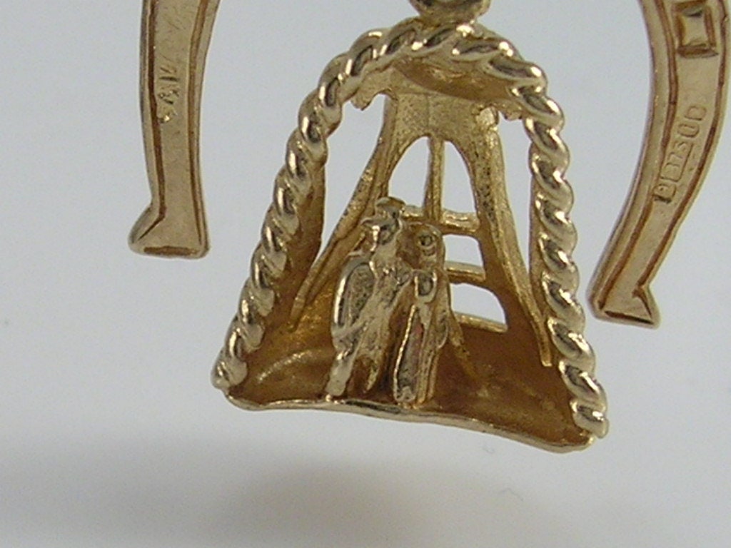 Vintage 3D 9ct Gold Lucky Horseshoe,Bell,Bride & Groom Charm Pendant H/MK 1964