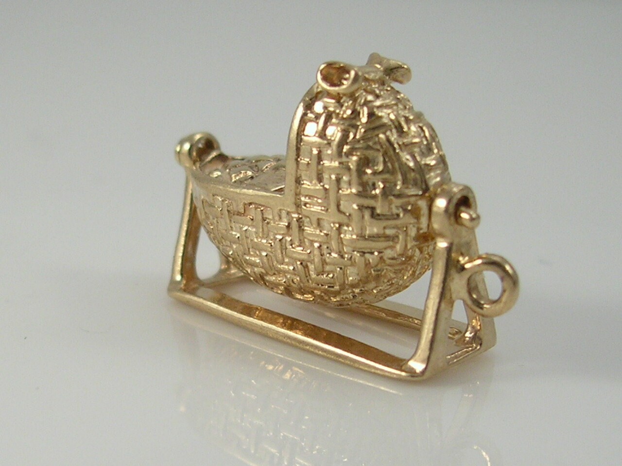 Vintage 3D 9ct gold baby in basket crib charm....movable basket turns