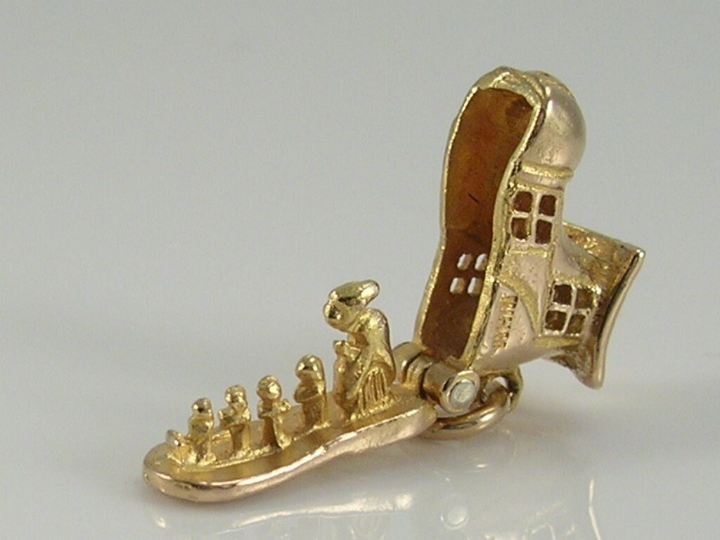 Vintage 3D 9ct gold old woman in shoe charm...opens to reveal old woman and her children