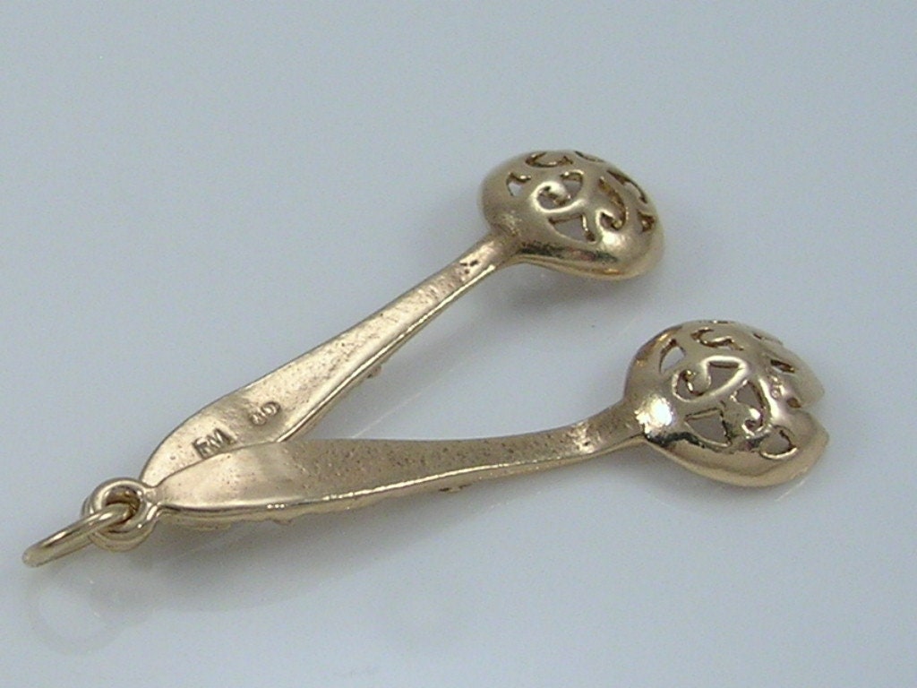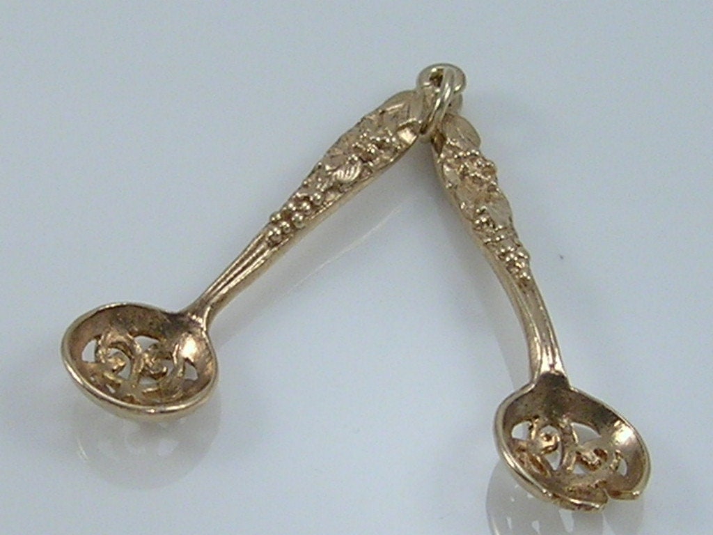 Vintage 3D 9ct gold ornate grapevine design salad server set charm...movable....each charm dangles freely from the central O ring