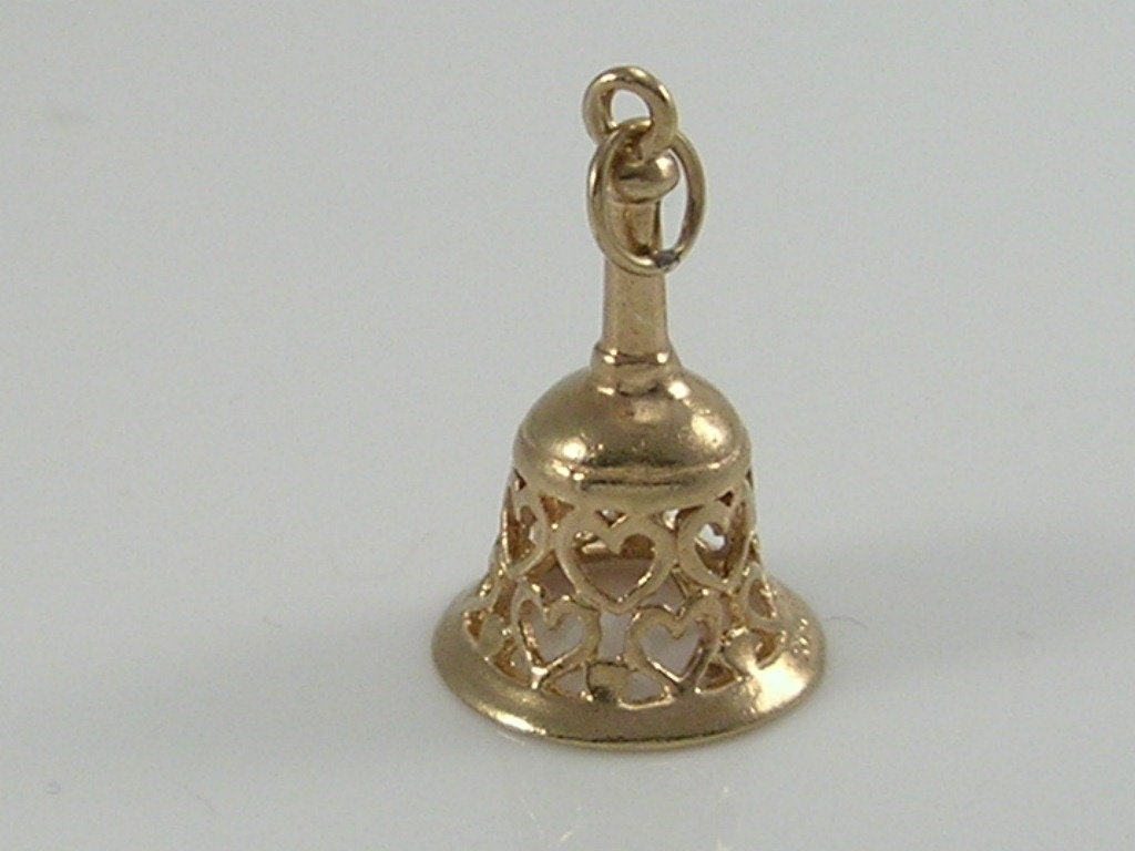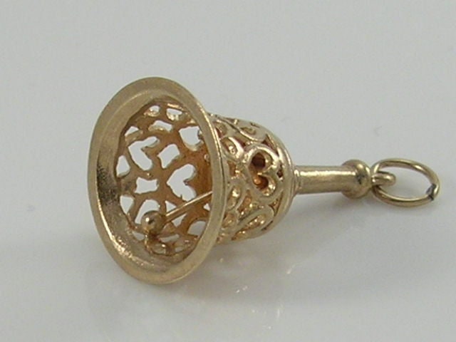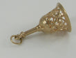 Vintage 3D 9ct gold ornate openwork heart design hand bell charm pendant...movable clapper inside the bell