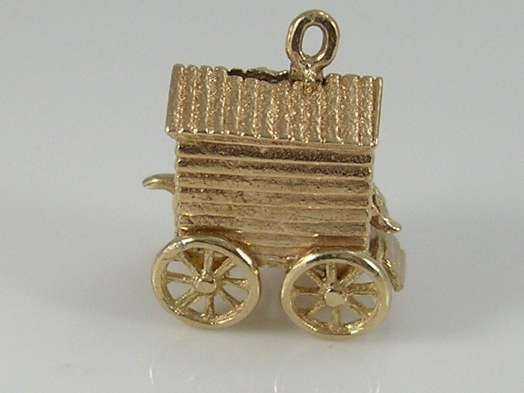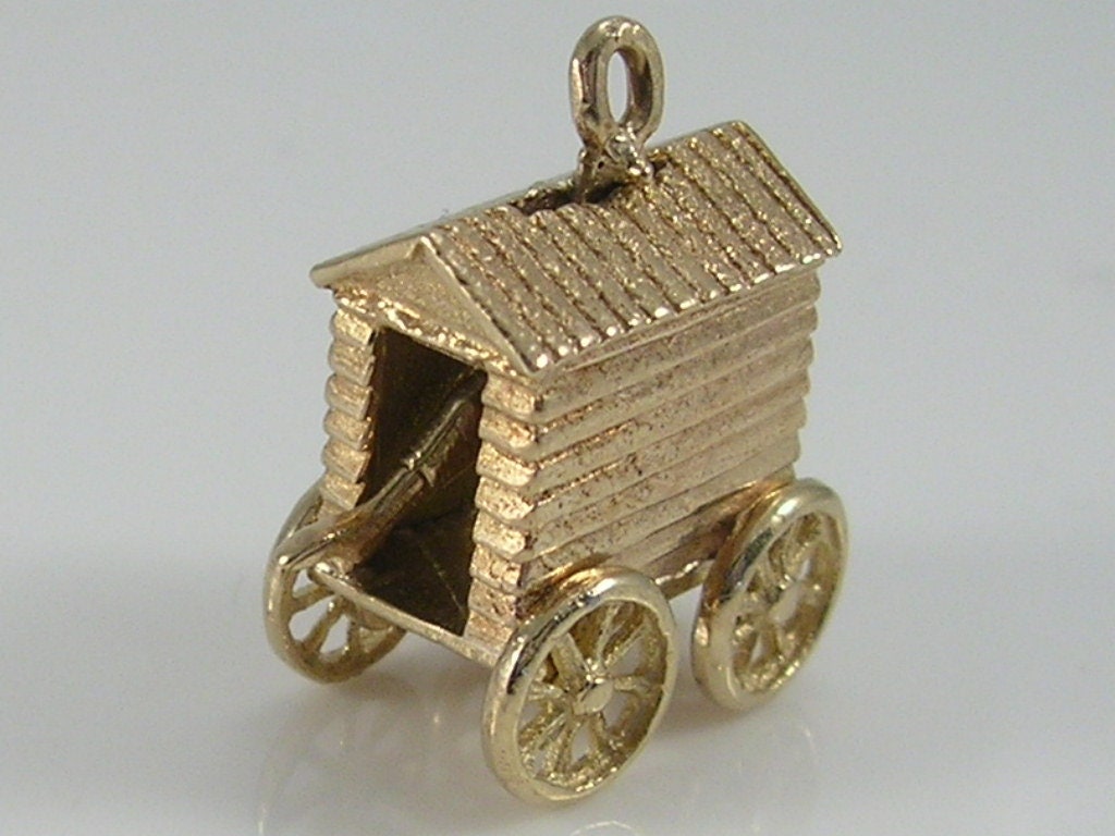 Vintage 3D 9ct gold Victorian beach hut with Wheels bathing machine charm pendant...movable legs