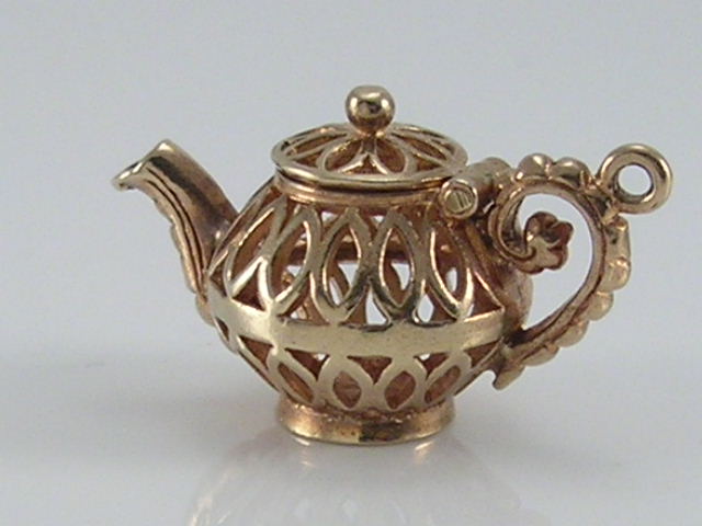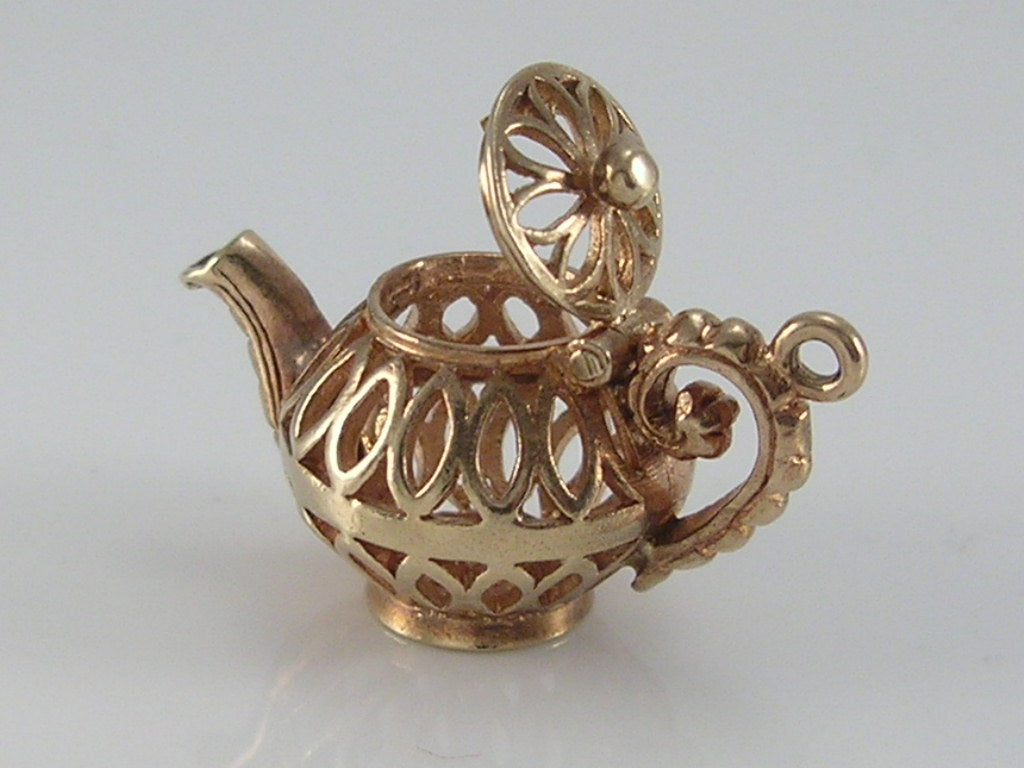Vintage 3D 9ct gold ornate openwork design teapot charm...lid opens