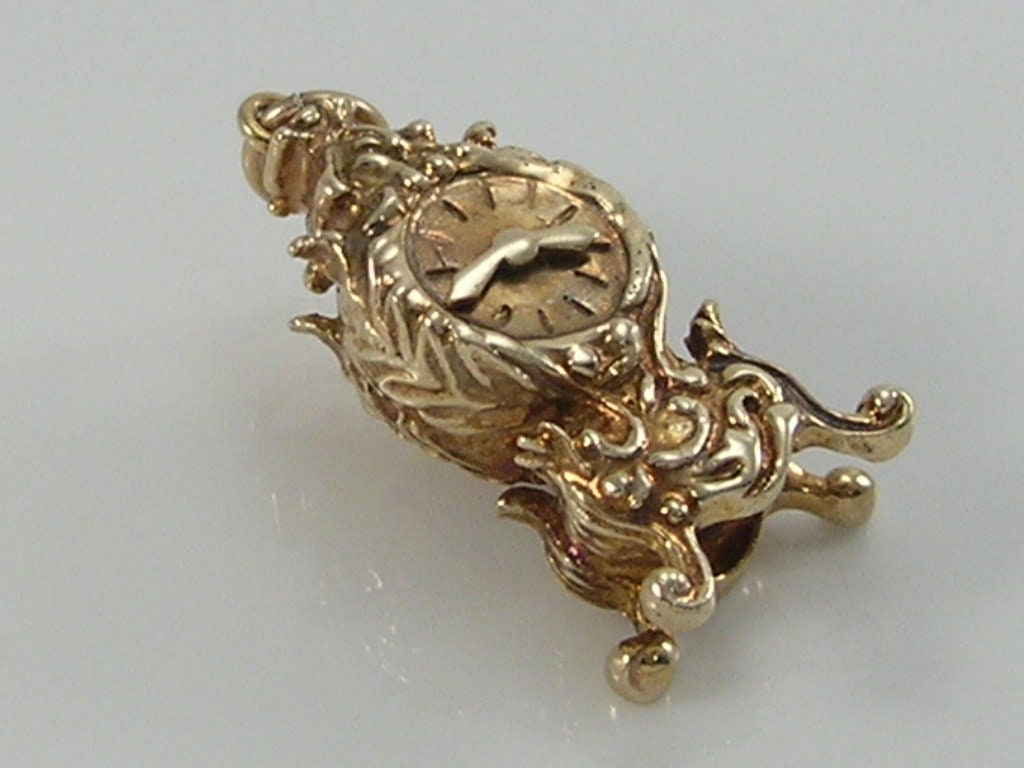 Vintage 3D gold mantle clock charm...movable the clock hands are fixed and move together...there is a little button that turns the hands at the back of the clock