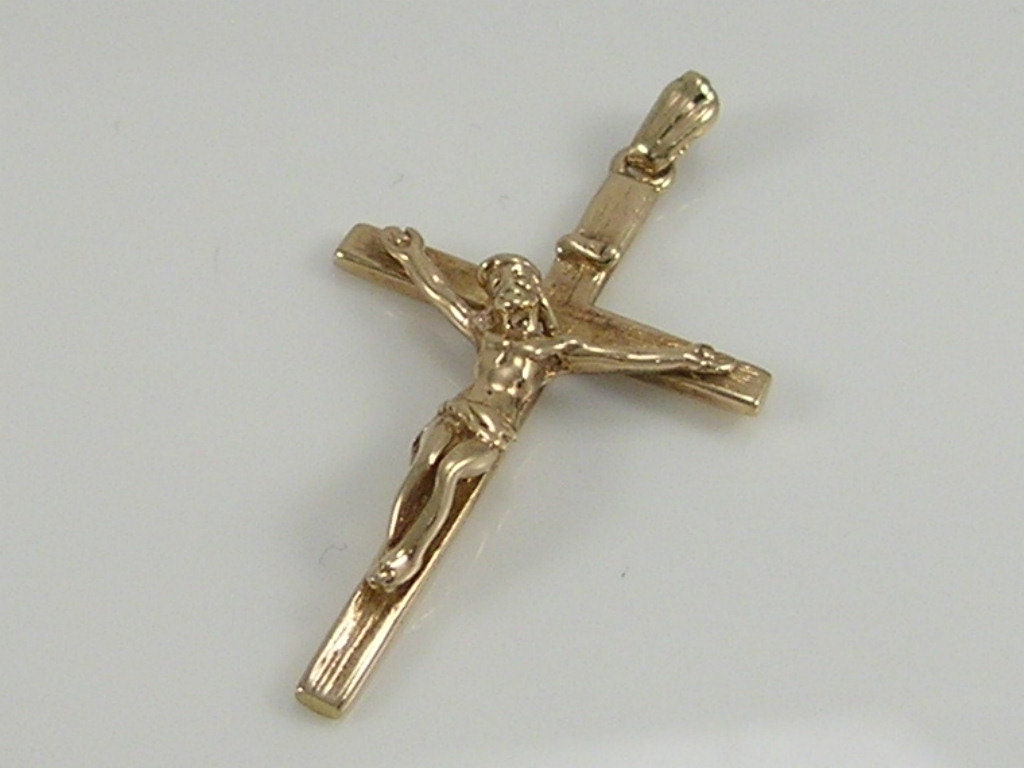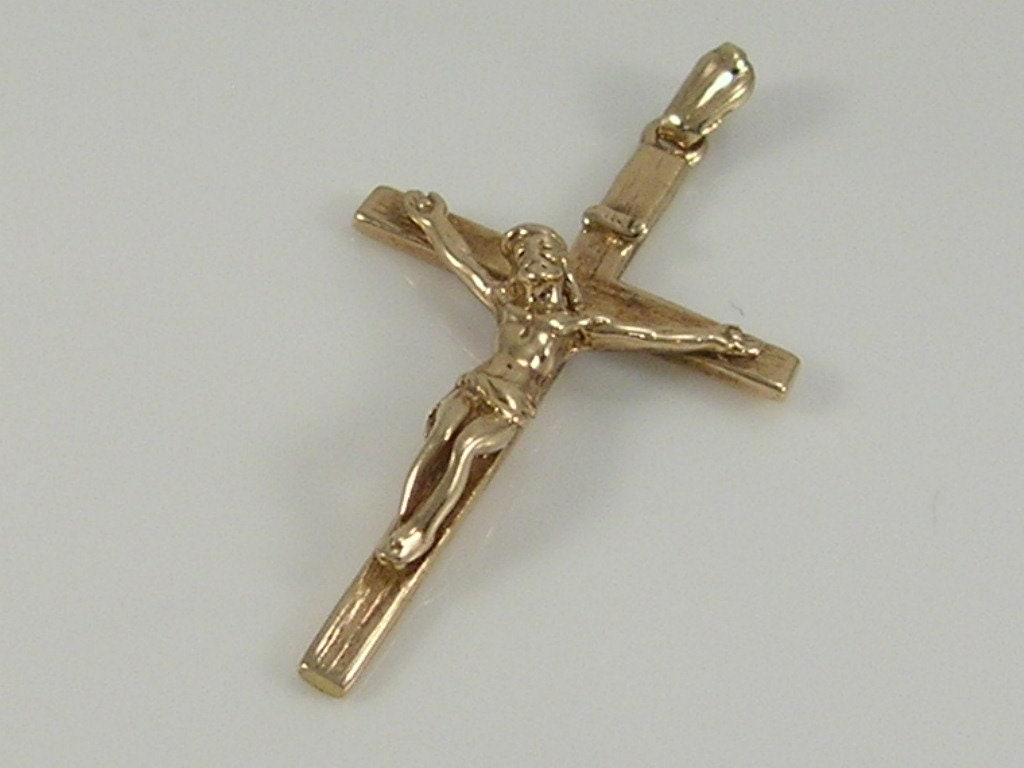 Crucifix cross measures approximately 33mm length excluding the little fixed ring and bail by 21mm width (1 & 5/16th's inch by 13/16th's of an inch)