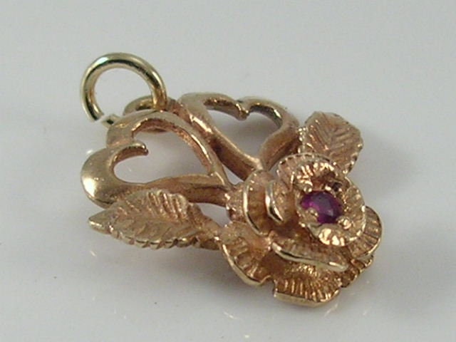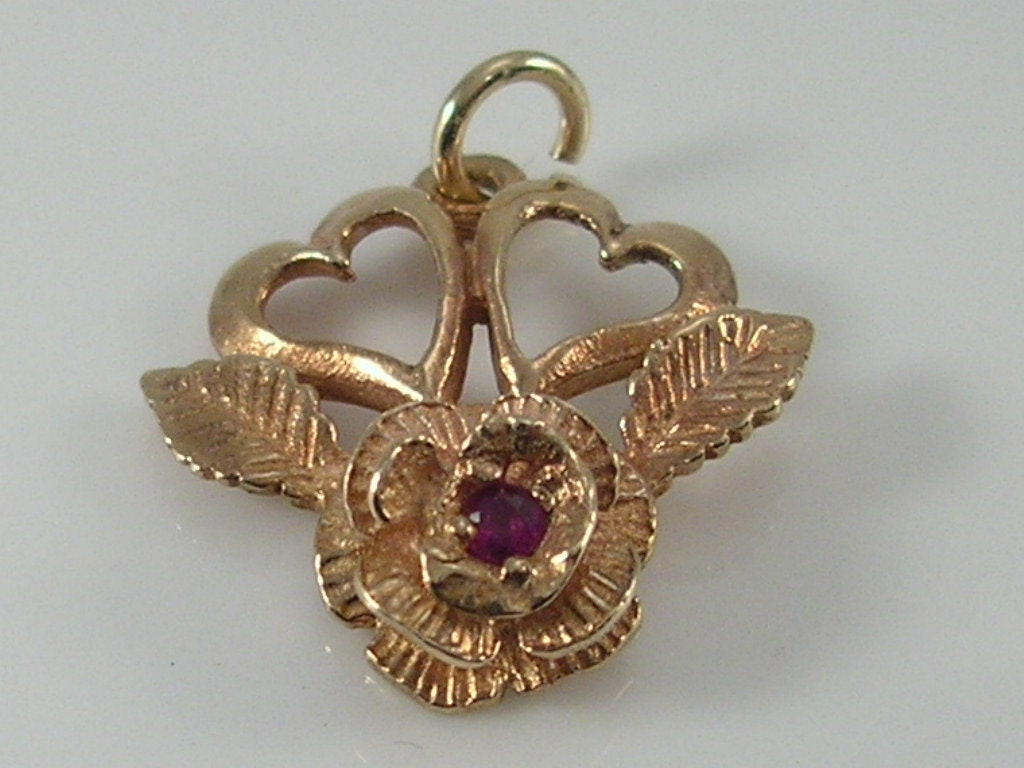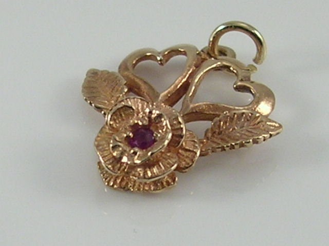 Vintage 9ct gold gemstone rose flower & hearts pendant charm
