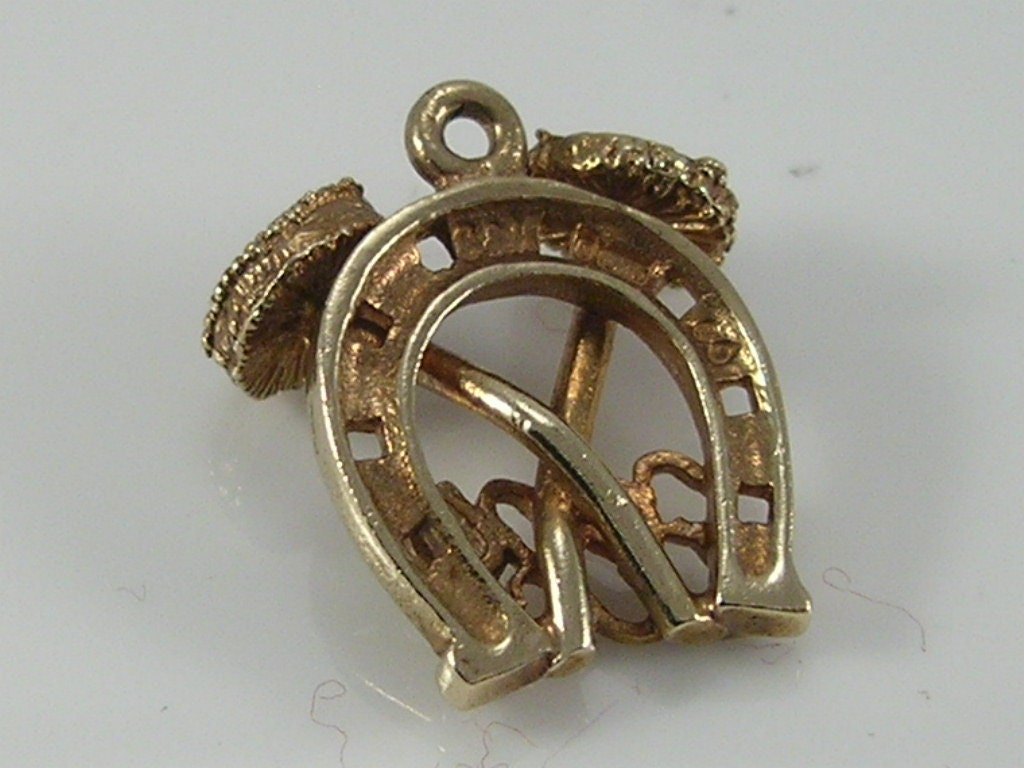 Vintage 9ct gold good luck horseshoe chimney sweep brushes charm pendant