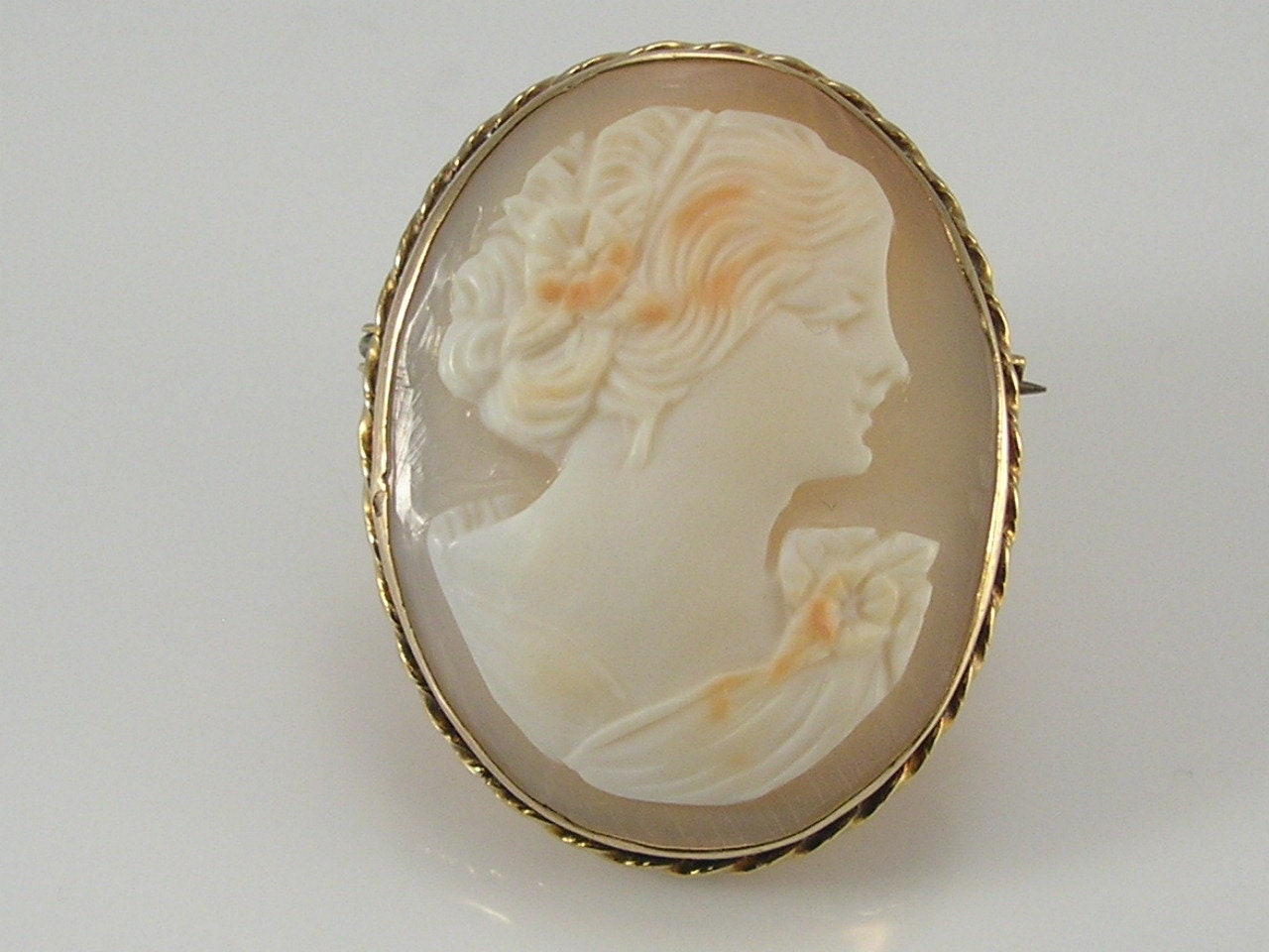 Vintage 9ct gold twisted rope design carved shell cameo brooch