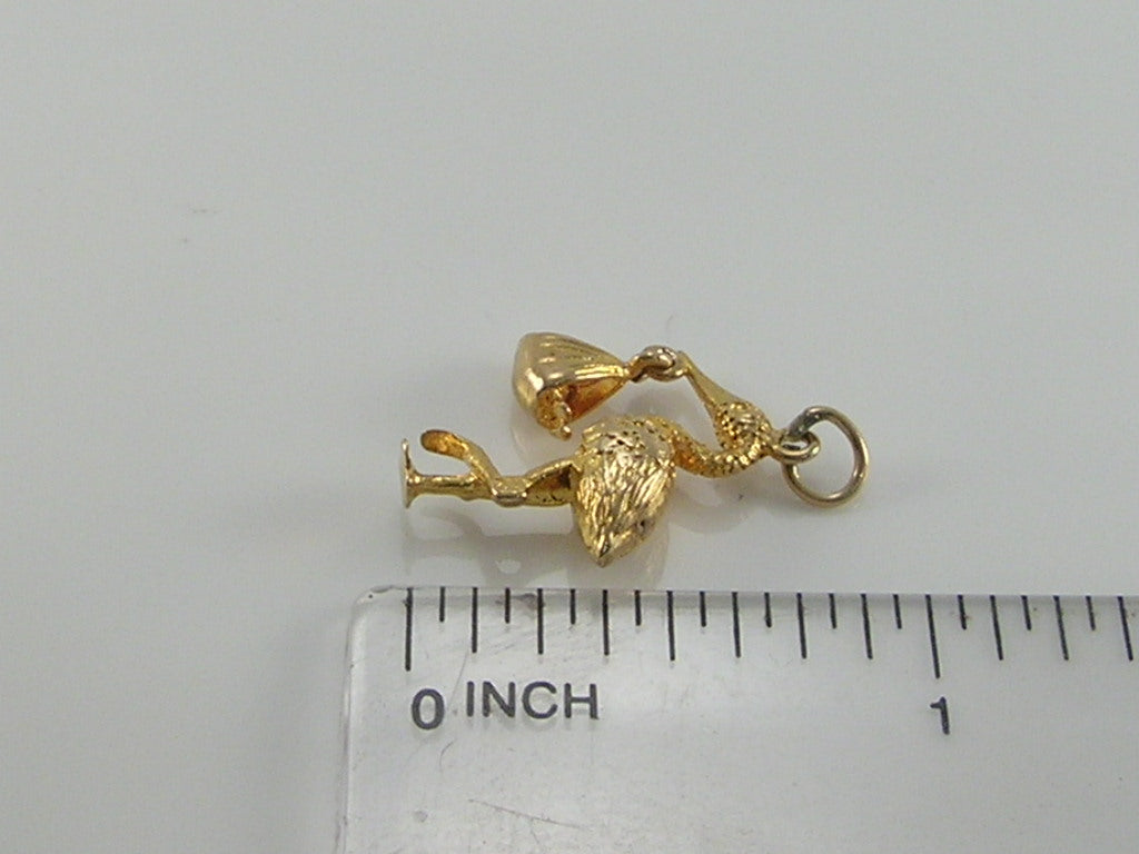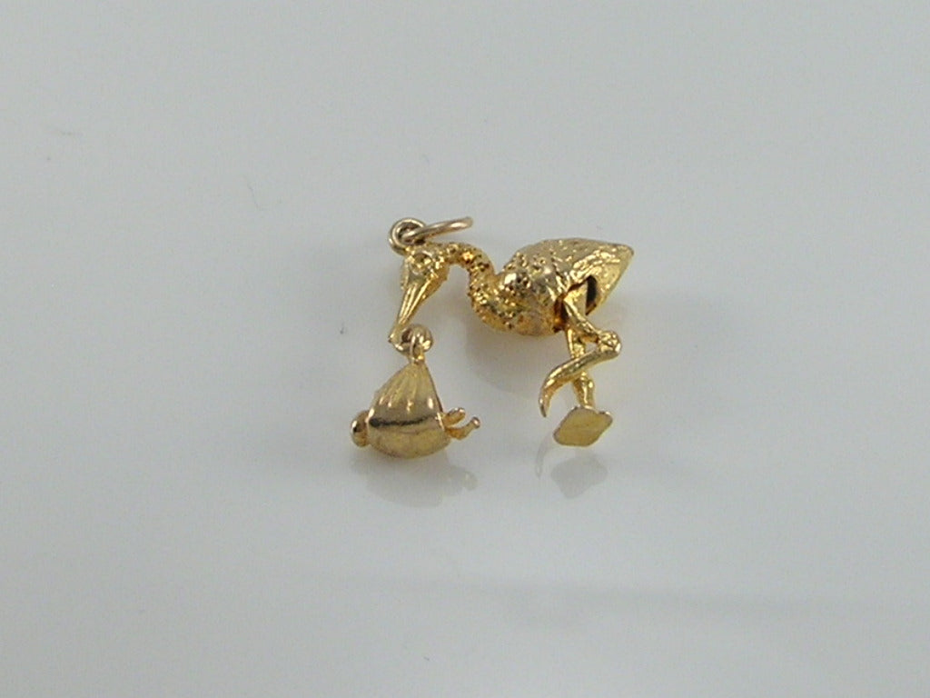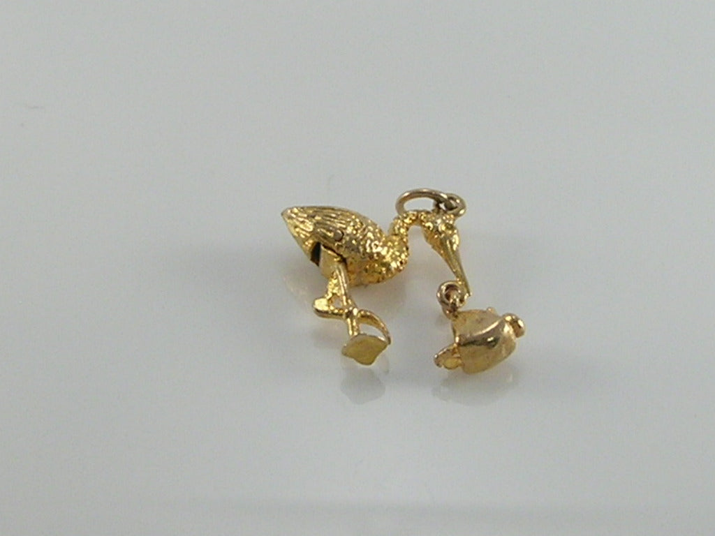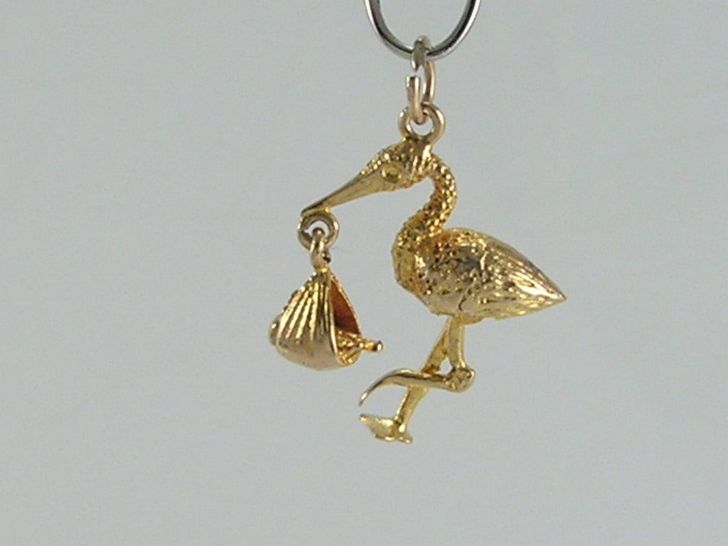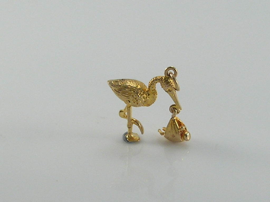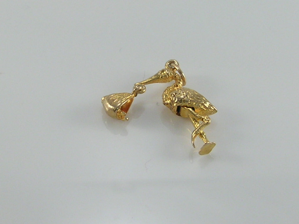 Vintage 3D 9ct gold stork and baby charm...movable baby wrapped in blanket dangles from storks beak